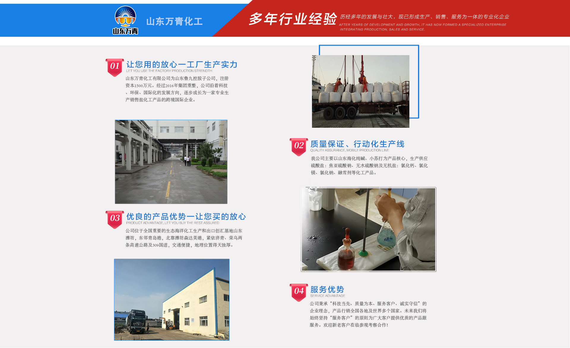 我公司成立于2018年10月17日,注册地在山东省潍坊市滨海区大家洼街道禧源路220号鸢都大厦二期办公楼229号,经营范围是一般项目:肥料销售;化工产品生产(不含许可类化工产品);化工产品销售(不含许可类化工产品);食品添加剂销售;货物进出口;技术进出口;国内货物运输代理;国内集装箱货物运输代理;运输货物打包服务;普通货物仓储服务(不含危险化学品等需许可审批的项目);装卸搬运;销售代理;信息咨询服务(不含许可类信息咨询服务);品牌管理;企业管理。(除依法须经批准的项目外,凭营业执照依法自主开展经营活动),主要经营纯碱,小苏打,焦亚硫酸钠,氯化钙,氯化镁,工业盐融雪剂等,注册资金叁佰陆拾万元整。公司坐落于山东...